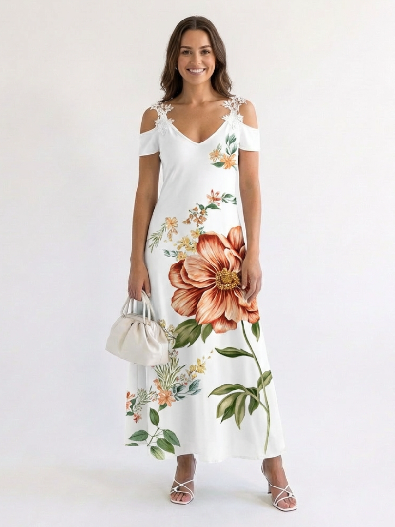 This dress features a beautiful off-shoulder style with a stunning 3D floral print. Made with soft, breathable polyester, it offers a comfortable and flattering fit. Its V-neck collar and mid-waist design make it perfect for holiday getaways or casual outings in warm weather.