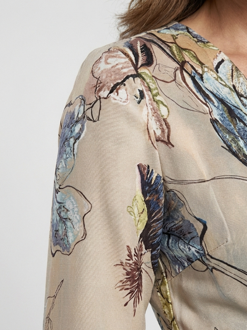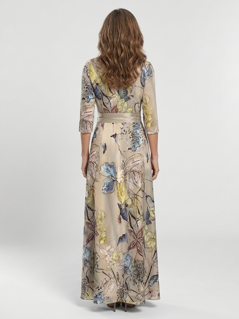This dress features a soft beige base with an allover floral print in muted tones. The wrap style bodice creates a V neckline, and the three quarter sleeves provide balanced coverage. It feels light with a smooth drape, making it comfortable for daytime gatherings or evening occasions.