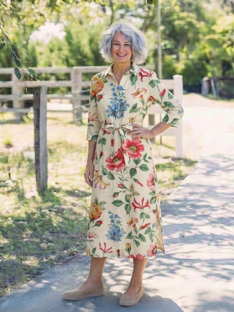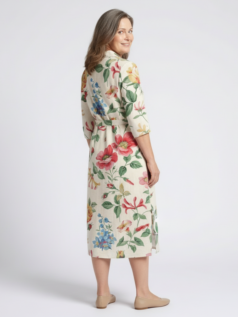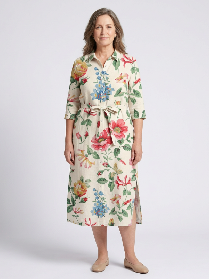 This dress features a flowing midi length with a soft collar neckline and half sleeves. The fabric has a light, breathable feel that allows the skirt to move naturally while remaining comfortable throughout the day. A button front bodice and softly gathered waist create gentle structure while keeping the overall look relaxed and easy to wear.